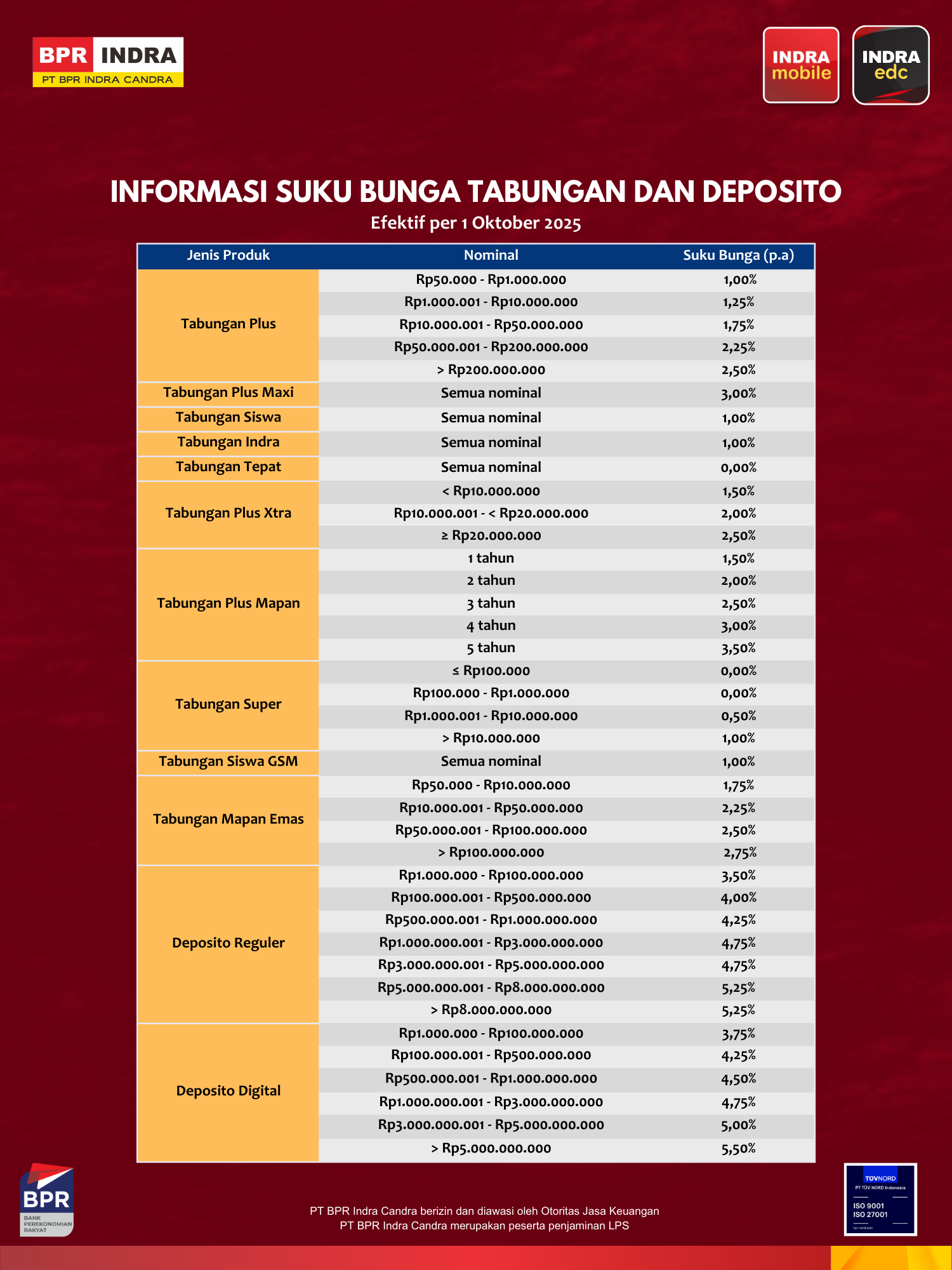 Ya, suku bunga dapat berubah sewaktu-waktu sesuai kondisi pasar melalui pengumuman kepada nasabah di seluruh jaringan kantor dan situs resmi BPR Indra.