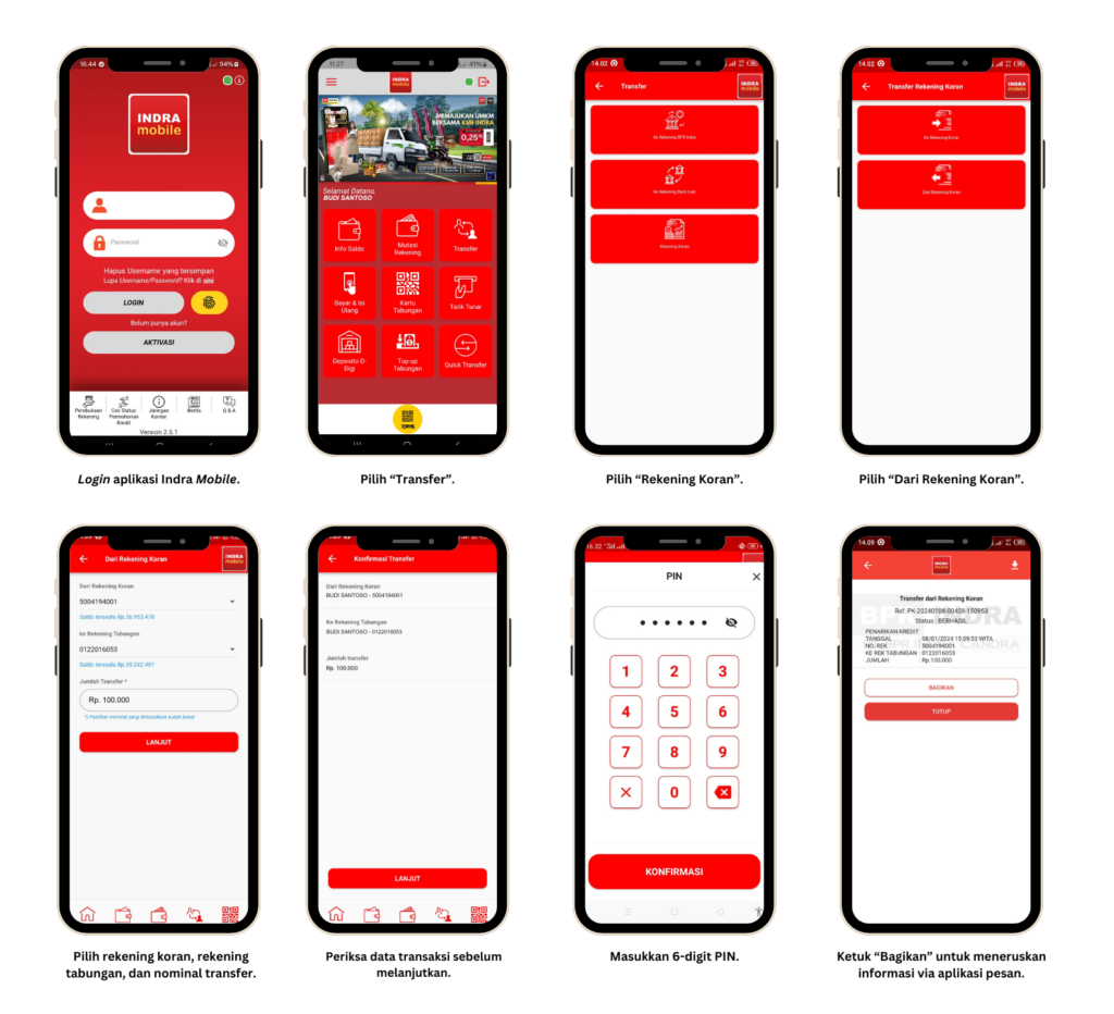4. Nasabah wajib memastikan ketersediaan dana pada rekening Nasabah sebelum melakukan transaksi melalui Indra Mobile. Nasabah harus mengisi semua data yang dibutuhkan untuk setiap transaksi secara benar dan lengkap.
